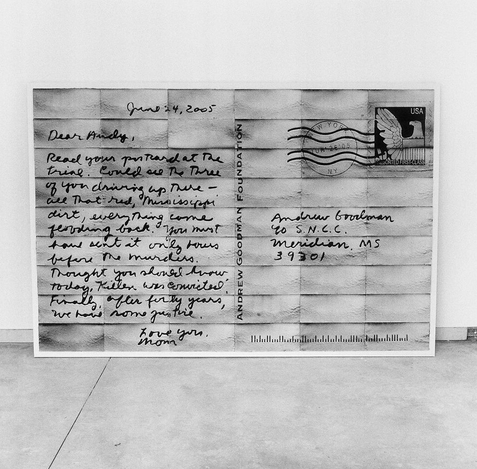 Dear Andy, 2006, Mickey and My James, 2008, are monumental postcards, fabricated in compressed lint, that Kelly wrote in commemoration of the three Civil Rights activists – Chaney, Schwerner and Goodman – murdered by Ku Klux Klan members in the 1964. This moving fictional correspondence tells the victims that their killers have been brought to justice forty years later. Kelly vectorized her own handwriting for the lint process to create awareness that the story is filtered through another voice.